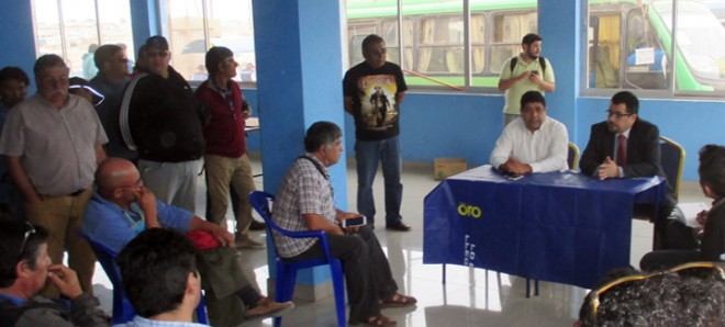 El Seremi Subrogante de Transportes y Telecomunicaciones, David Pasten Carrasco, y el Director del Trabajo de Tarapacá, Víctor Inostroza Flores, sostuvieron una fructífera reunión que se extendió por alrededor de una hora con los conductores de la Línea 1 de Taxibuses Transatélite, quienes habían optado por paralizar sus funciones en busca de mejoras en sus condiciones laborales.