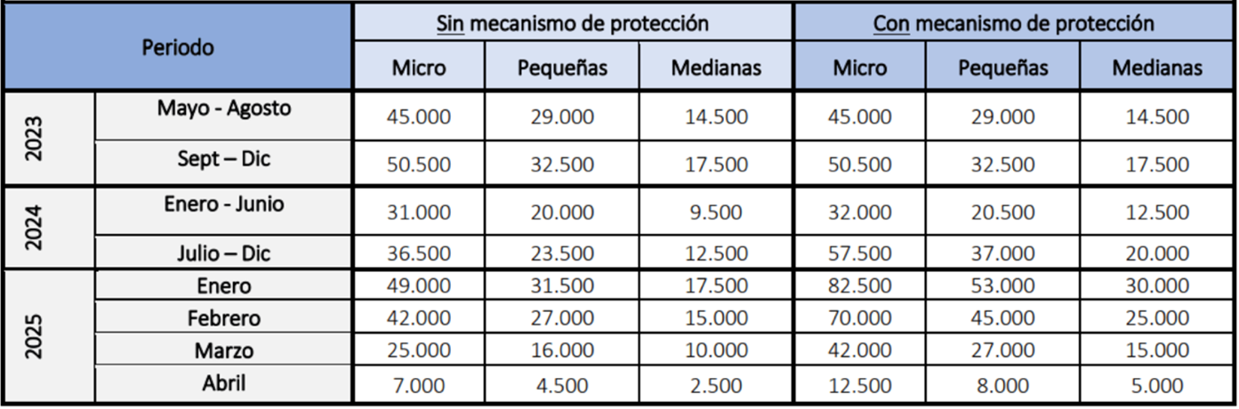 En concreto, se propone un subsidio que consiste en un esquema estable de montos para cada uno de los periodos de alza del salario mínimo, el cual varía según tamaño de empresa (micro, pequeña y mediana), con el objeto de entregar mayor cobertura y protección a las microempresas.