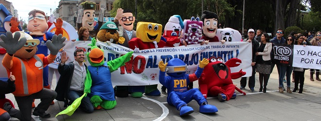 Innovadora y colorida fue la puesta en escena que lograron los 17 corpóreos que firmaron su compromiso en contra del trabajo infantil a través de un desafío deportivo llevado a cabo en la Plaza de Armas de Punta Arenas, lugar donde se desarrolló el primer partido de fútbol entre “mascotas” institucionales ejecutado en la región.