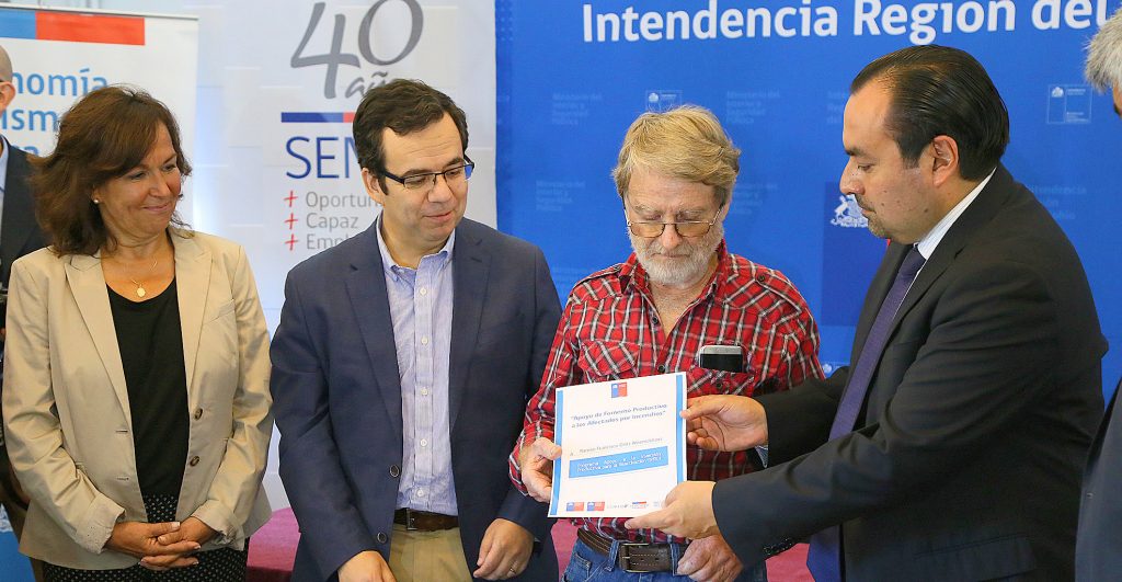 Junto al titular de Economía, la secretaria de Estado entregó los beneficios a empleadores y trabajadores afectados por los incendios.