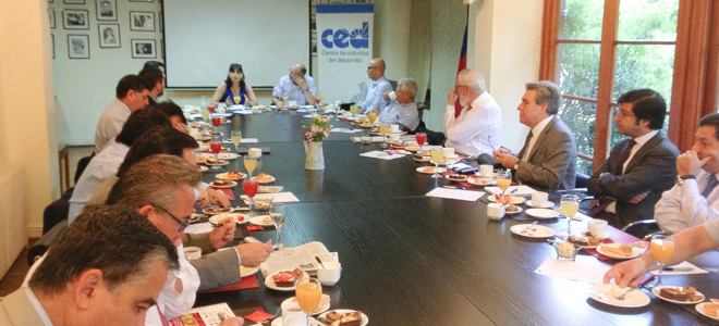 En la oportunidad la secretaria de Estado conversó junto al presidente del directorio del CED, Eduardo Saffirio, con una treintena de invitados, entre los que se encontraban Juan Villarzú, Andrés Sanfuentes, Juan Somavía; y Guillermo Larraín.