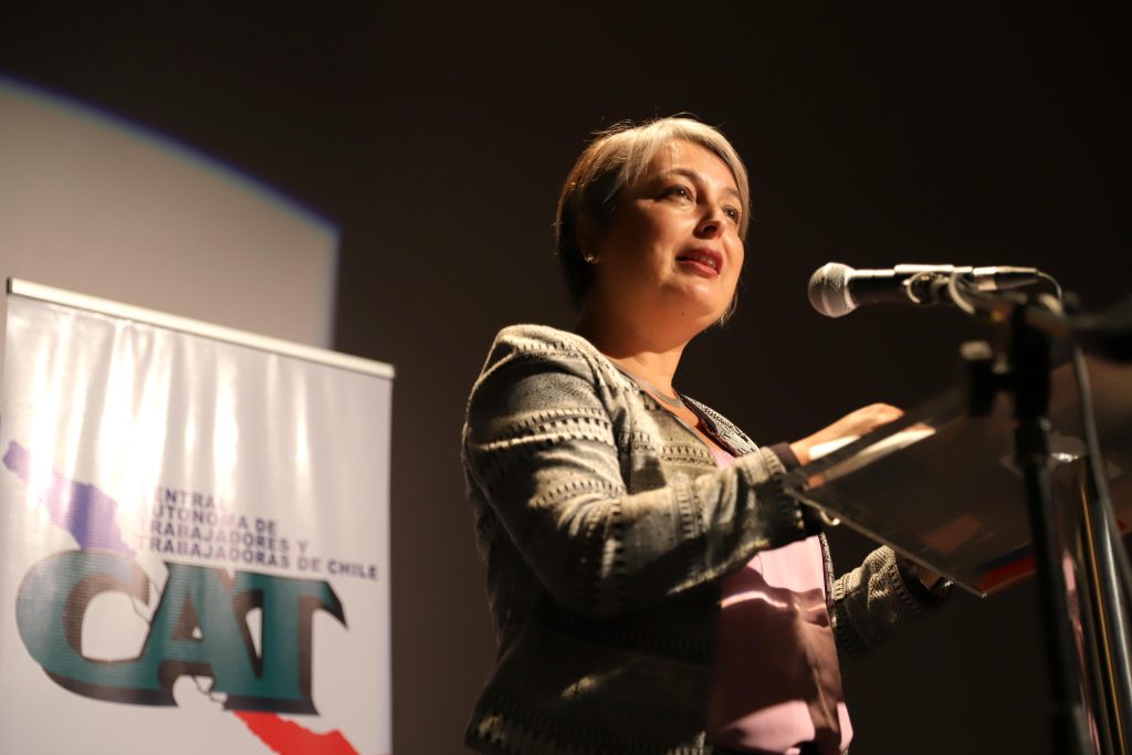 La ministra Jara agradeció la invitación de la presidenta de la CAT y de la vicepresidenta de la Mujer del gremio sindical, Magdalena Castillo y Andrea Rojas, respectivamente. En la actividad también participaron la subsecretaria de Bienes Nacionales, Marilen Cabrera; la alcaldesa de Santiago, Irací Hassler; y delegados de Perú, Venezuela, Brasil y Ecuador.