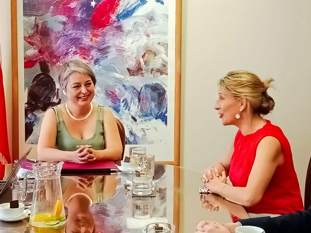 La ministra del Trabajo y Previsión Social, Jeannette Jara, se reunió este domingo con la vicepresidenta segunda y ministra de Trabajo y Economía Social de España, Yolanda Díaz, con quien compartió experiencias y abordó, en una cita que se extendió por casi dos horas, materias como el trabajo decente y el diálogo social.