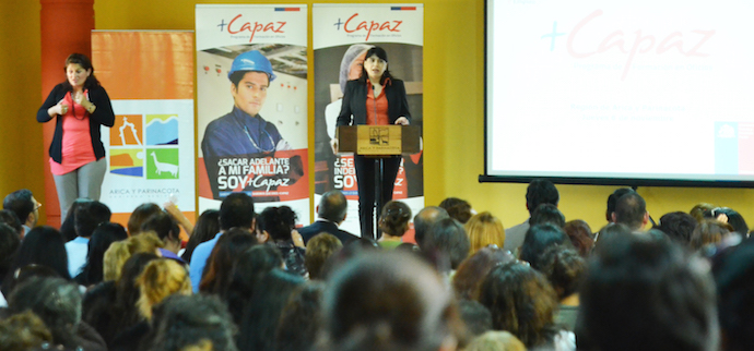 Ante una masiva convocatoria de 300 personas la Ministra del Trabajo y Previsión Social, Javiera Blanco, difundió en Arica el programa de capacitación +Capaz que otorgará mil cupos en 2015 en la Región de Arica y Parinacota.