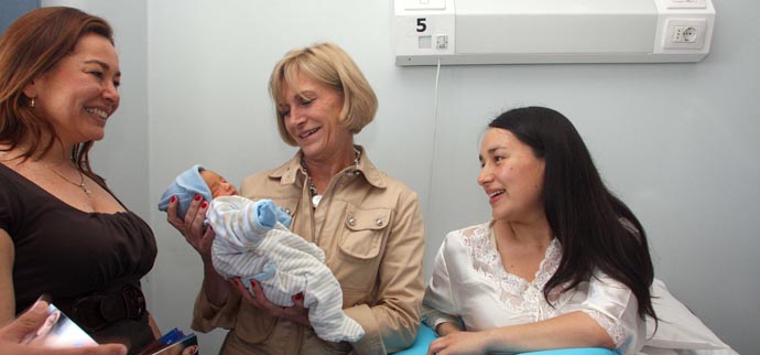 La ministra del Trabajo y Previsión Social, Evelyn Matthei, en compañía de la ministra (S) del Sernam, Jessica Mualim, llegaron hasta el Hospital Clínico de la Universidad de Chile para detallar alcances y responder dudas a madres trabajadoras con bebés recién nacidos que son beneficiarias de la nueva ley de posnatal de 6 meses.