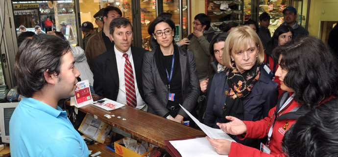 La ministra del Trabajo y Previsión Social, Evelyn Matthei, lideró hoy una extensa fiscalización en locales comerciales de la ciudad de Puerto Montt, en los días previos a la celebración de Navidad, cuando aumenta notablemente la actividad en este sector.