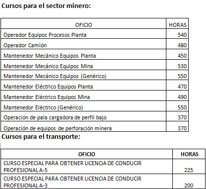 Minería, transportes, forestal, acuícola, montaje industrial son algunas de las áreas de la actividad económica en que podrán desempeñarse quienes accedan a estos planes de formación técnica. Se formarán especialistas en operación de equipos de perforación minera, mecánicos de equipos de planta, conductores profesionales licencia A-3 y A5, operación de camiones forestales y de equipos de maderero, buzos para labores acuícolas, montaje industrial mecánico y eléctrico, enfierradura, soldadura para montaje industrial, entre los variados planes de formación.