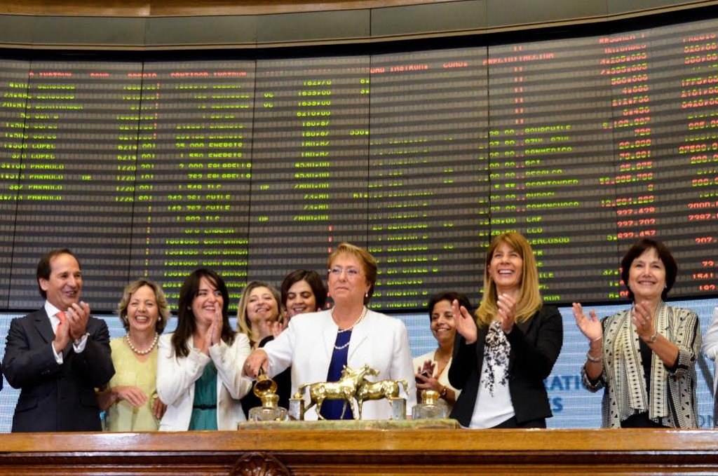 La Ministra del Trabajo y Previsión Social, Ximena Rincón acompañó a la Presidenta Michelle Bachelet en el toque de campanas que forma parte de la campaña Mundial de ONU Mujeres, la Bolsa de Comercio de Santiago y Pacto Global: “Que la Igualdad de Género Suene Fuerte”.