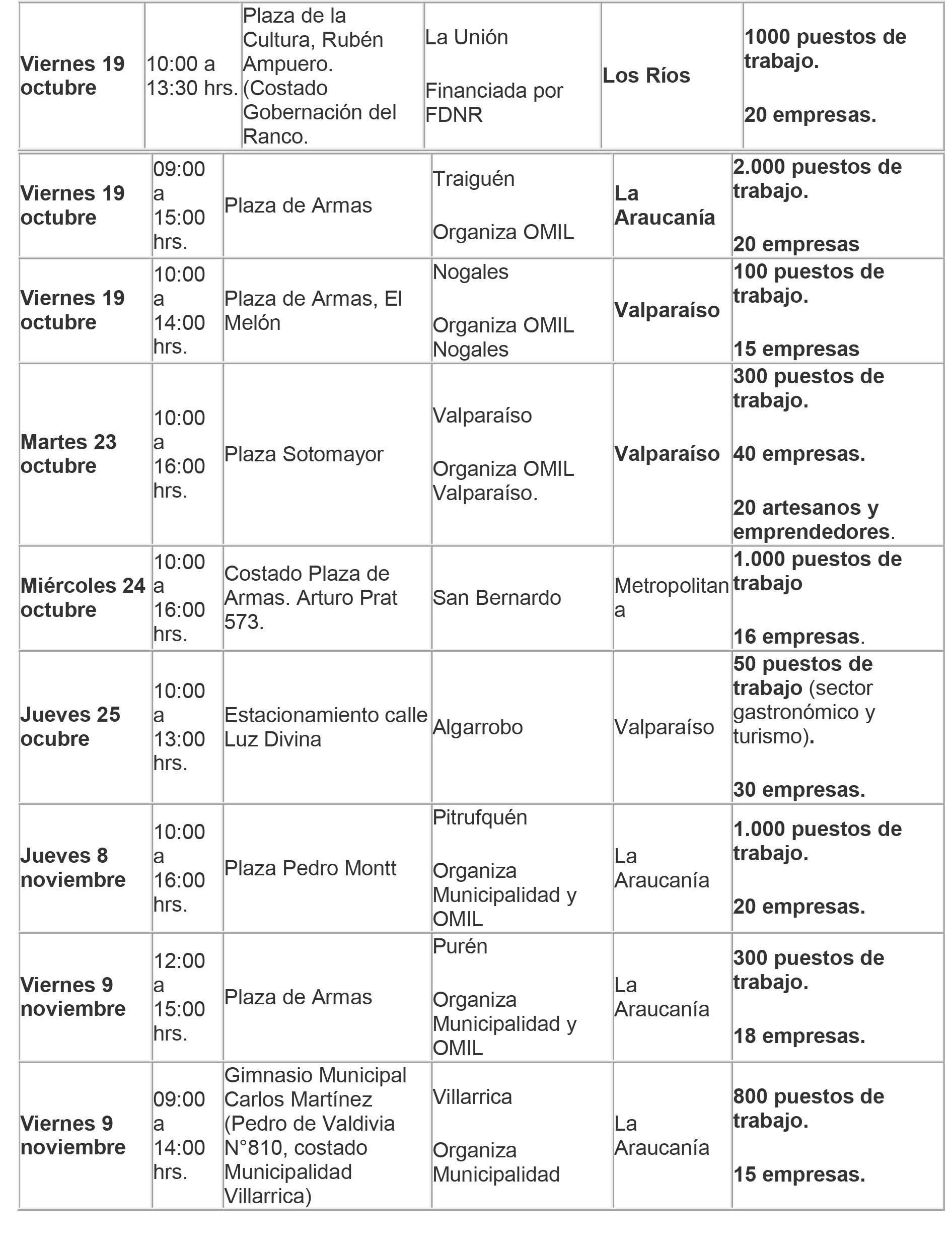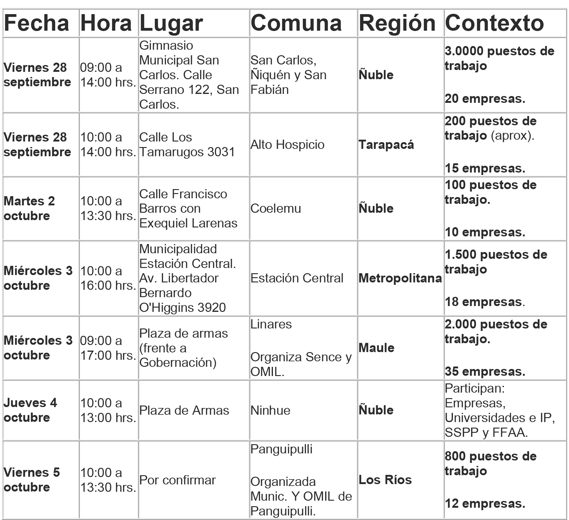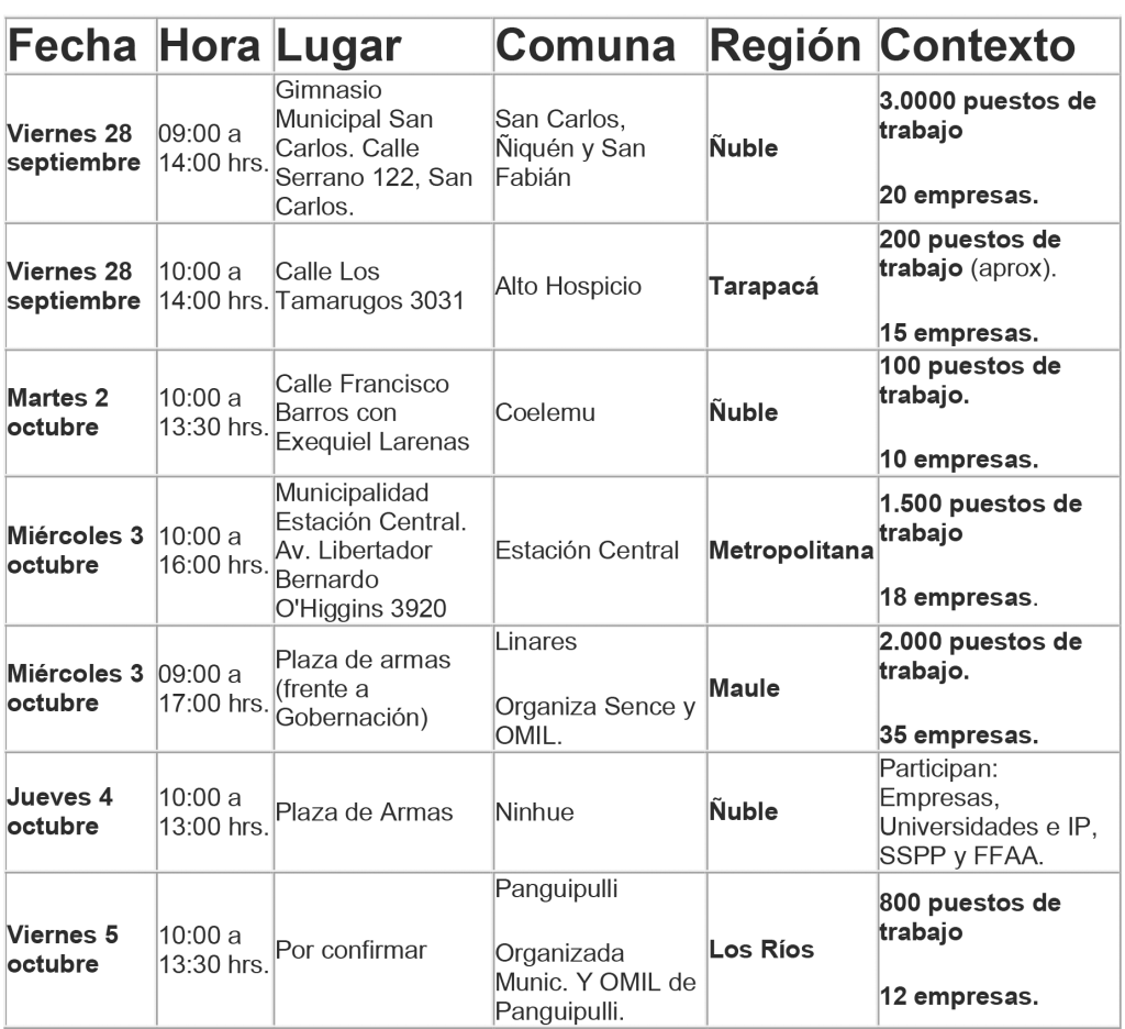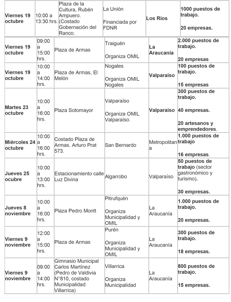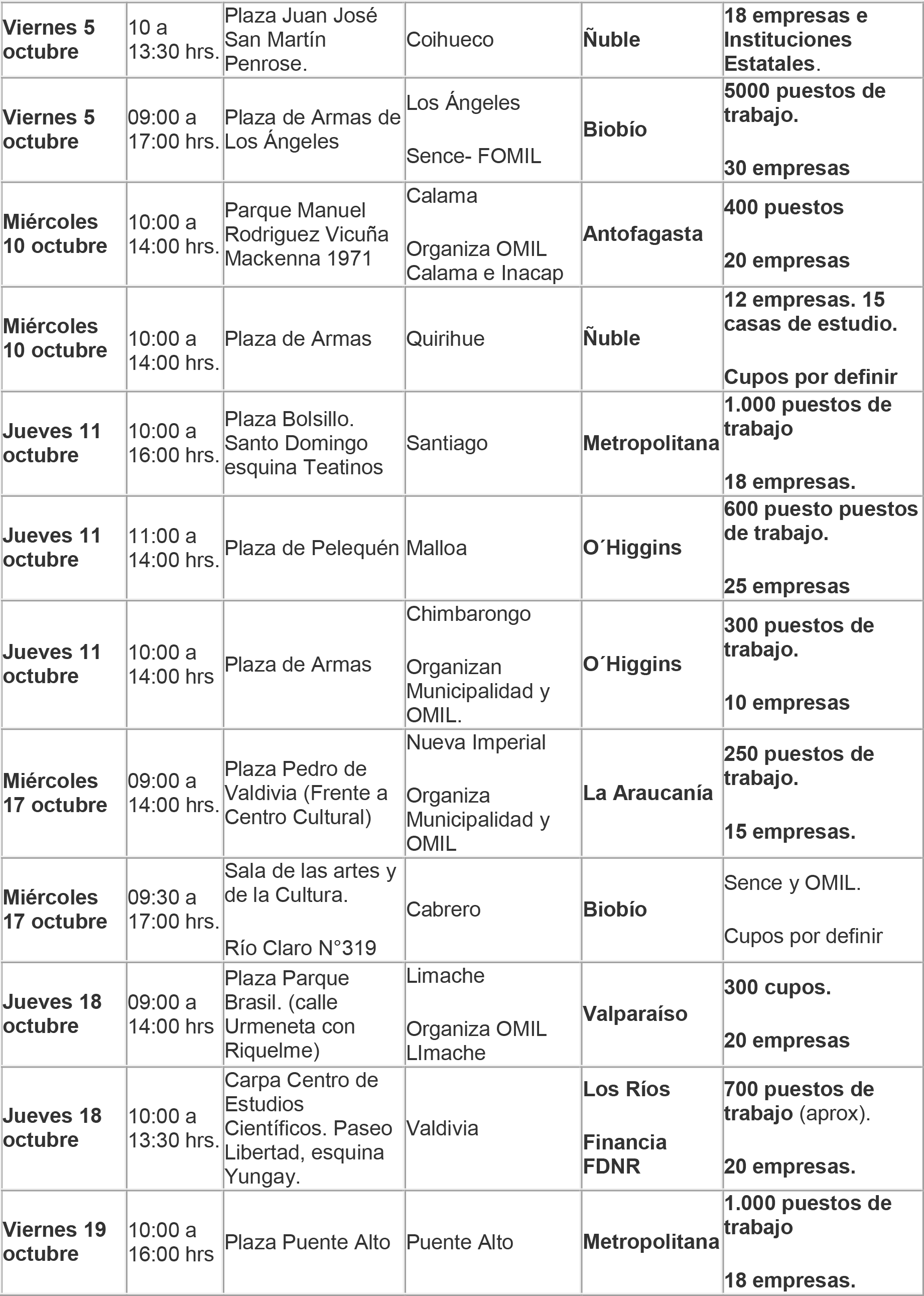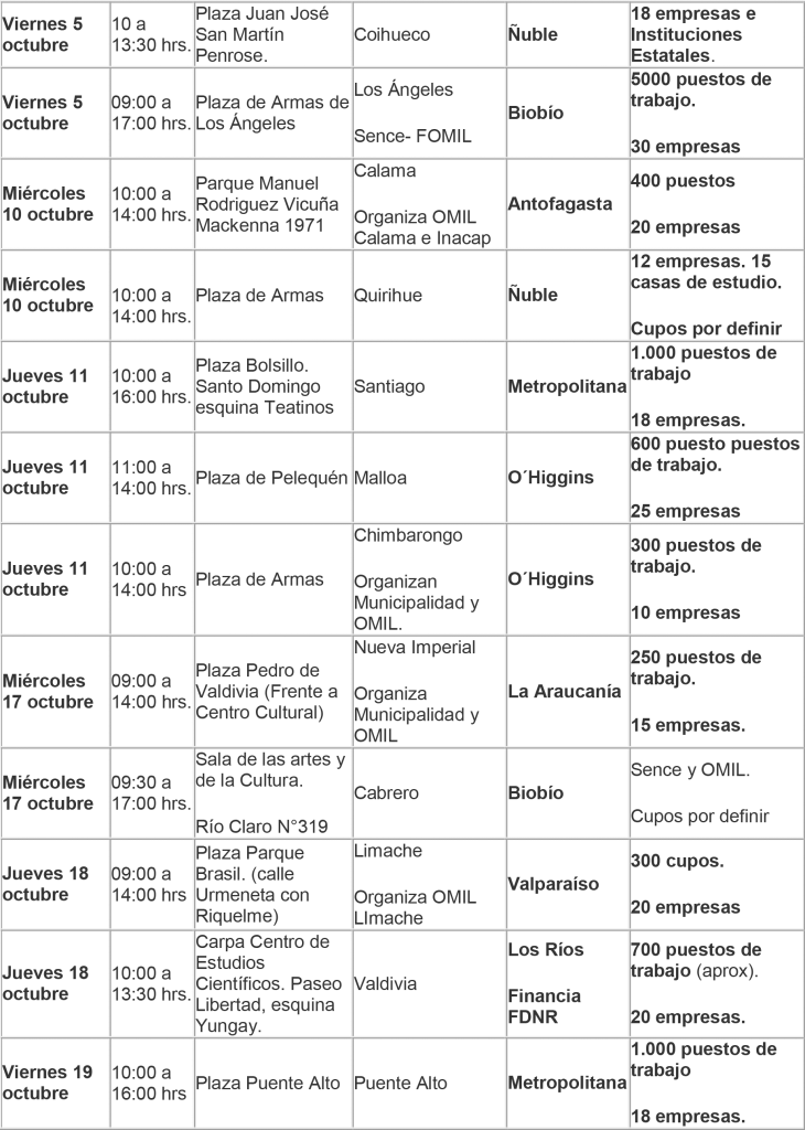 La iniciativa contempla la realización de 50 ferias laborales en todo el país. La primera fase se llevará a cabo en 8 regiones, entre septiembre y noviembre de 2018, que crearán más de 21.500 empleos. La segunda fase se llevará a cabo a partir de diciembre de este año.