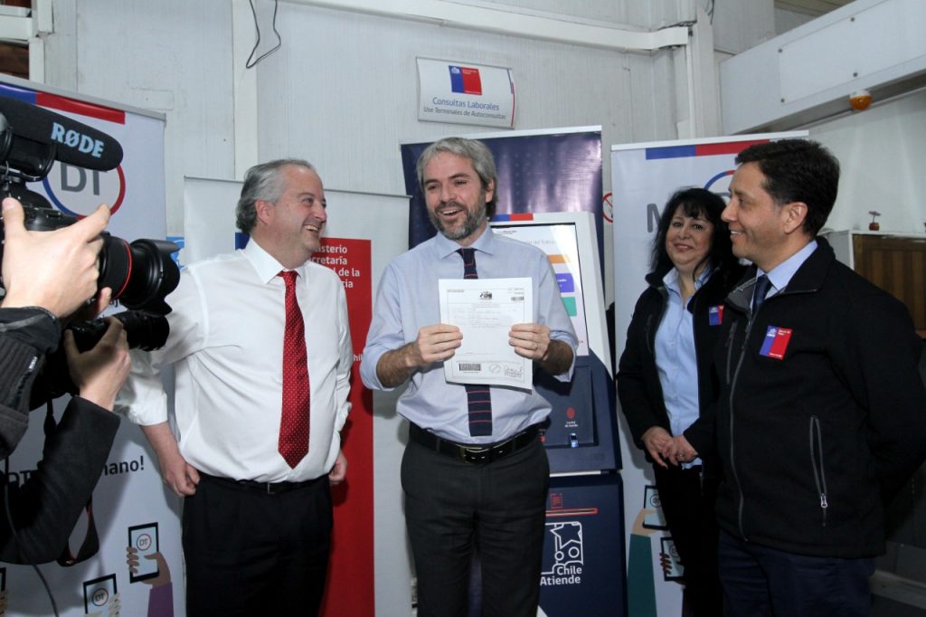 Junto al Director Nacional del Trabajo, Mauricio Peñaloza, ambos ministros visitaron el módulo de autoatención de la DT ubicado en la Inspección Provincial de Santiago Centro donde lanzaron oficialmente esta plataforma habilitada desde febrero en el sitio www.direcciondeltrabajo.cl y que permite a trabajadores, dirigentes sindicales y empleadores realizar electrónicamente gestiones y diversos trámites.