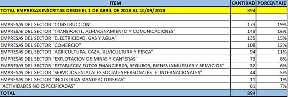 Empresas inscritas por sectores (estas cifras son al 10 de septiembre):