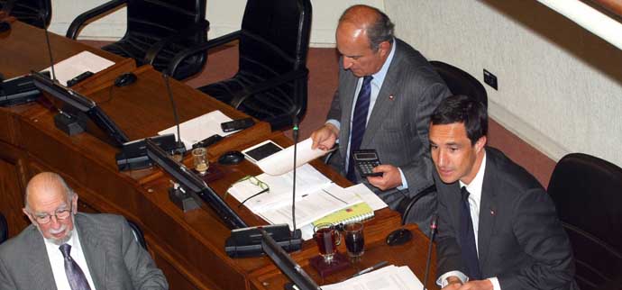 El ministro del Trabajo y Previsión Social, Juan Carlos Jobet, junto a su par de Agricultura, Luis Mayol, asistió a la sesión especial que el Senado citó para este mediodía, con el objeto de abordar el fenómeno de las heladas en la zona central del país y su efecto en la agricultura.