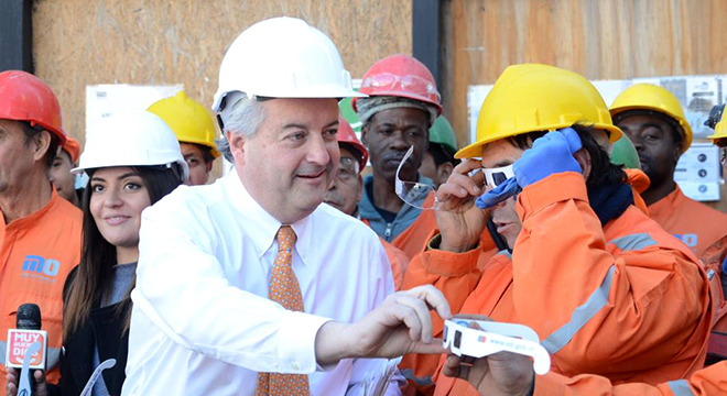 El Ministro del Trabajo y Previsión Social, Nicolás Monckeberg, junto al director del Instituto de Seguridad Laboral (ISL), Manuel Cañón, y el vicepresidente de la Cámara Chilena de la Construcción (CChC), Antonio Errázuriz, se reunieron con 120 trabajadores de la construcción de una obra de la constructora Mena y Ovalle, en la comuna de Vitacura, con el fin de difundir las medidas de seguridad que deben adoptar durante el eclipse solar que se producirá este martes 2 de julio.