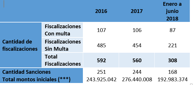 Entre enero y junio de 2018, se han realizado 308 fiscalizaciones, totalizando 87 sanciones por un monto de $192.983.374, la mayor cantidad de ellas son por no comparecer a la citación de la Dirección del Trabajo.