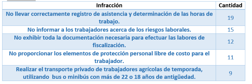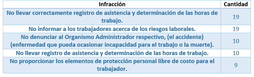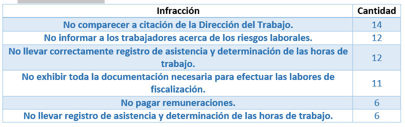 Primeras 5 sanciones más cursadas por la Dirección del Trabajo por infracción a la normativa laboral en este sector.