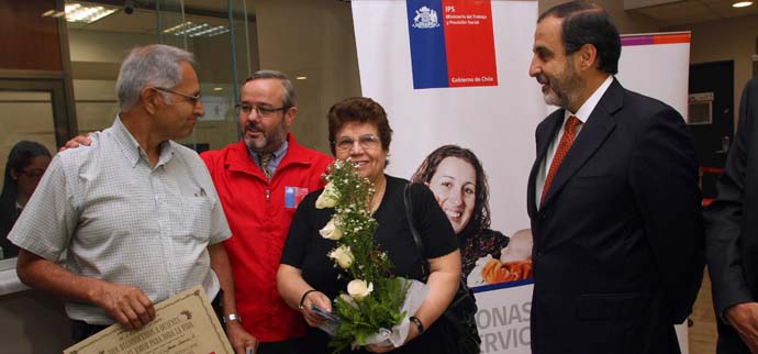 En el Día de San Valentín, el ministro (S) del Trabajo y Previsión Social, Bruno Baranda; junto al subsecretario de Previsión Social, Augusto Iglesias, acompañó a una pareja que cumplió 50 años de matrimonio a cobrar su bono Bodas de Oro, beneficio que reconoce a quienes han logrado el cumplimiento de medio siglo casados.