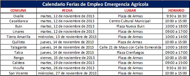 El Ministerio del Trabajo y Previsión Social y el Ministerio de Agricultura determinaron aquellas regiones y comunas donde es mejor realizar las 12 “FERIAS DE EMPLEO EMERGENCIA AGRÍCOLA”. Estas comunas con sus respectivas fechas son:
